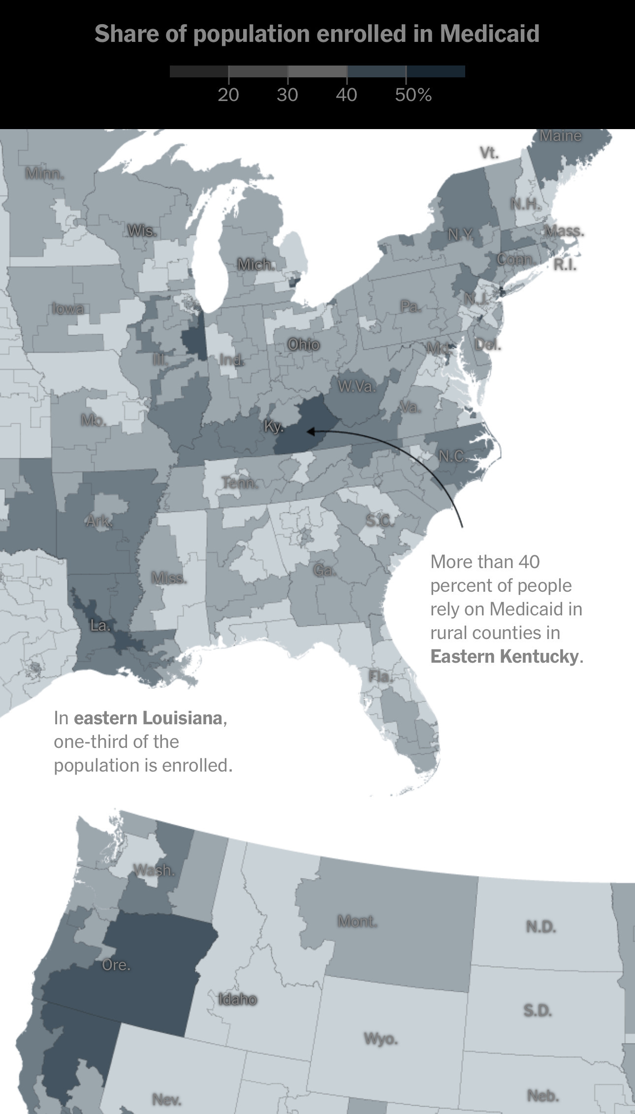 Back to 2025 June 12, 2025 at 4:08 AM I was reading this article from the New York Times and found this map interesting. The eastern half of Oregon that wants to secede and join Idaho? Over 40% of the population is on Medicaid.